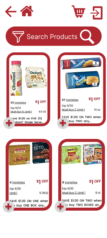 While the abundance of deep red creates a strong brand image, it also means the high-contrast white-on-red top and bottom toolbars fight for the user’s attention. The tightly spaced options in the sidebar, further clutter the the hierarchy. Core functionality like the personal ad, digital coupons, and rewards should be emphasized, while secondary functionality like ID, support and the shopping cart (“My List”) should be de-emphasized.